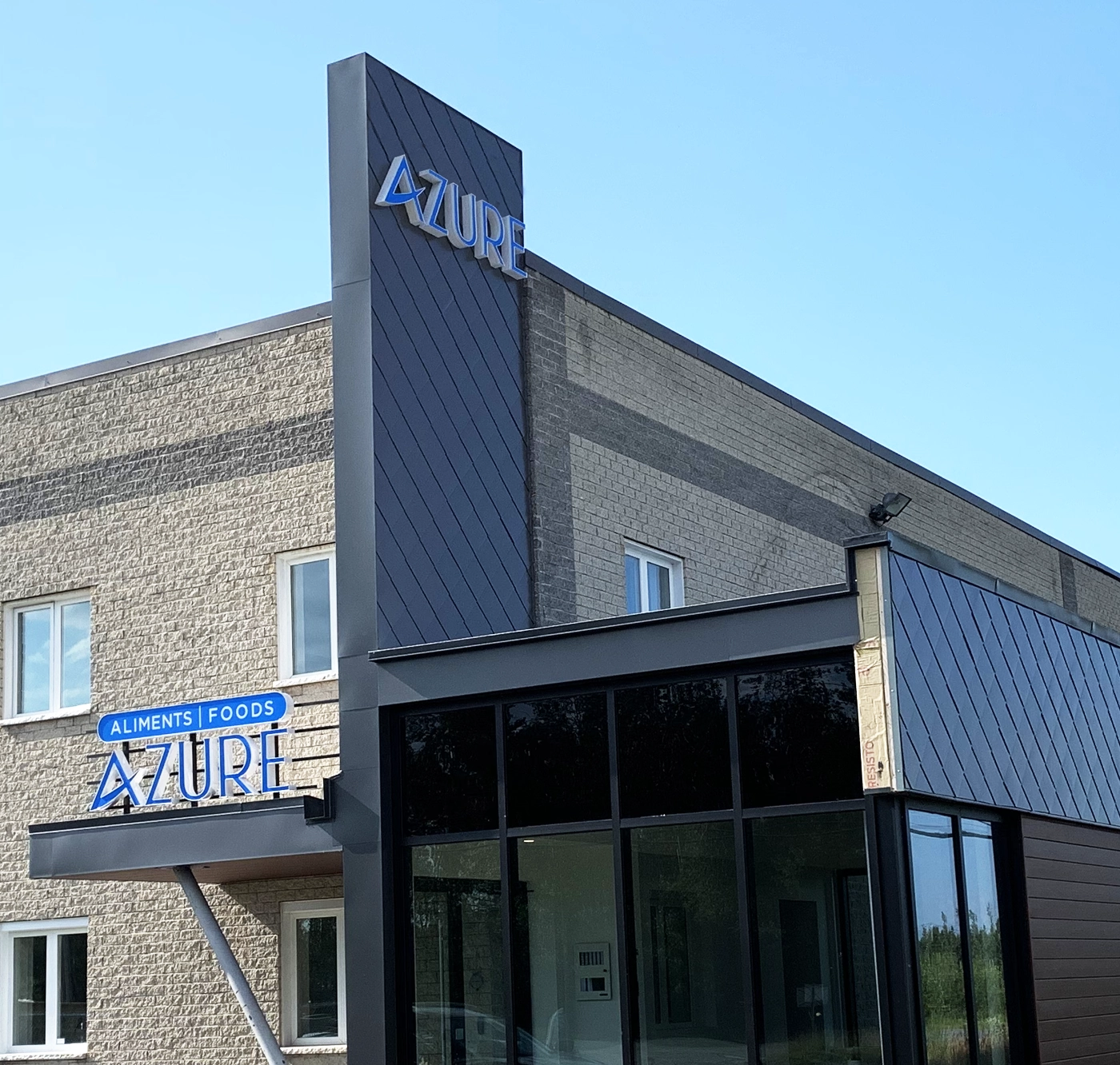 Azure est une entreprise alimentaire située à Granby ayant pour mission d’offrir des produits de première qualité aux grossistes en fruits de mer. Nous avons été mandaté par l’équipe d’architectes sur place pour l’étude d’espace et la fabrication de l’affichage ayant pour but d’identifier sa location.